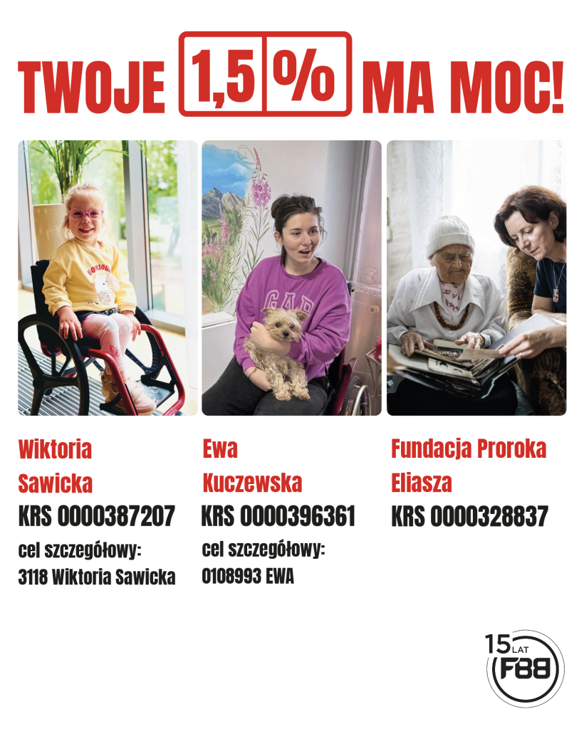 Zachęcamy Was do przekazania 1,5% swojego podatku na wsparcie tych, których już dobrze znacie: Ewa, Wiktoria, Fundacja Proroka Eliasza